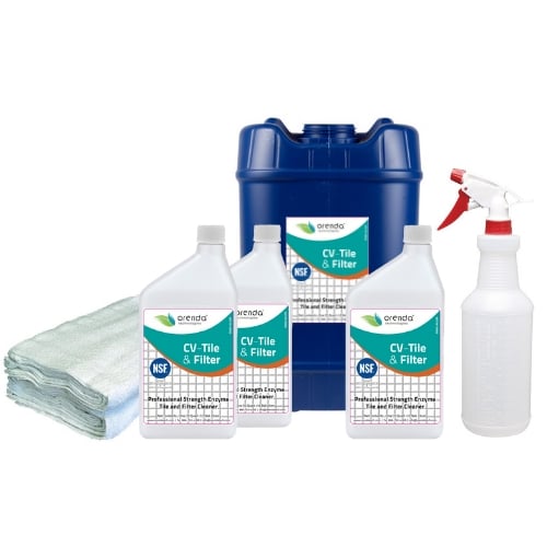 CV-Baldosa y Filtro (CV-Tile and Filter, en inglés) es un limpiador de superficies enzimático completamente natural. Este producto está específicamente diseñado para limpiar líneas de baldosas sucias (líneas de escoria), superficies y pisos de salas de bombas, plataformas de piscinas y filtros de cartuchos. CV-Baldosa y Filtro utiliza nuestra enzima CV-600.